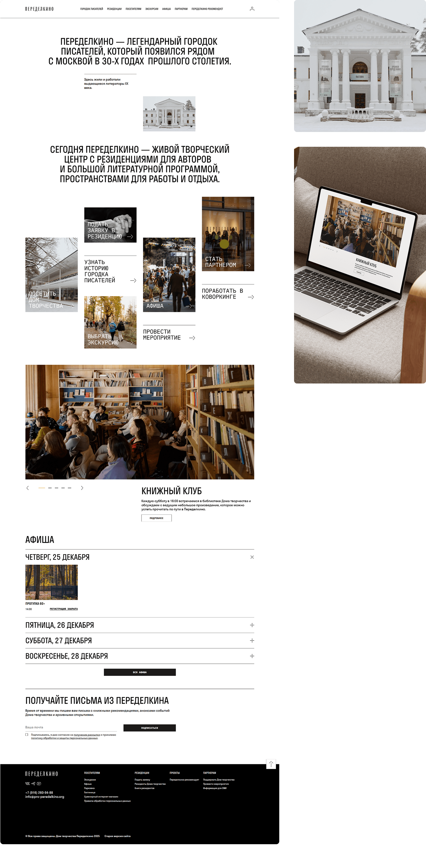 Цифровая платформа, отражающая миссию и культурную значимость Дома творчества Переделкино — исторического творческого центра, возникшего в 1930-х годах как «городок писателей» и продолжающего в настоящем поддерживать литературное и художественное сообщество. Проект объединяет богатое наследие литературной истории с современными форматами взаимодействия, включая резиденции, публичные программы, мероприятия и сервисы для посетителей.